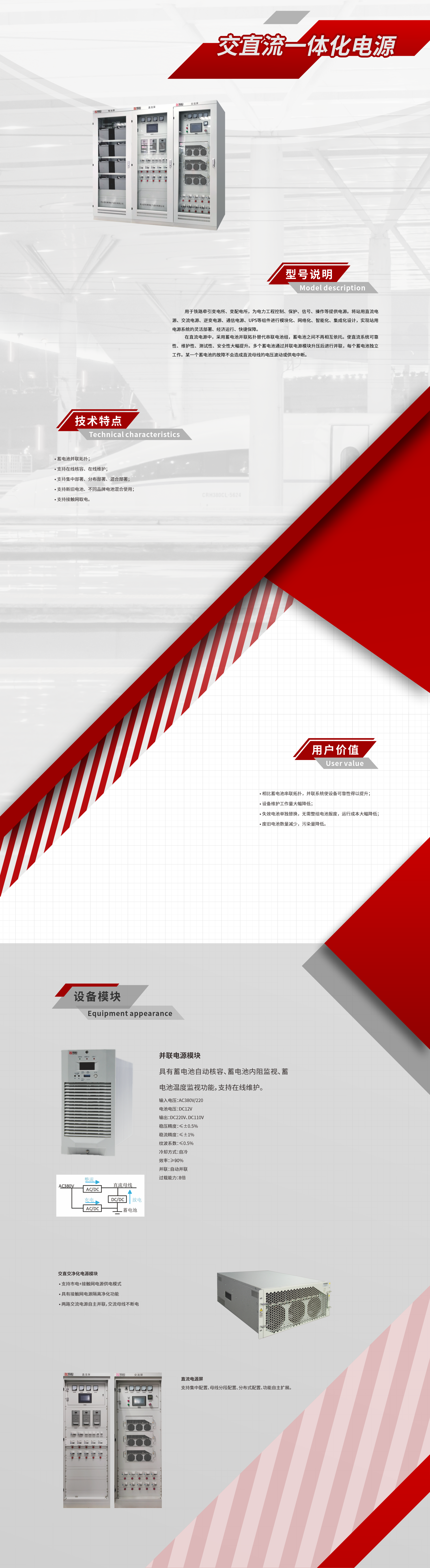 用于鐵路牽引變電所、變配電所,為電力工程控制、保護、信號、操作等提供電源。將站用直流電源、交流電源、逆變電源、通信電源、UPS等組件進行模塊化、網絡化、智能化、集成化設計,實現站用電源系統的靈活部署、經濟運行、快捷保障。