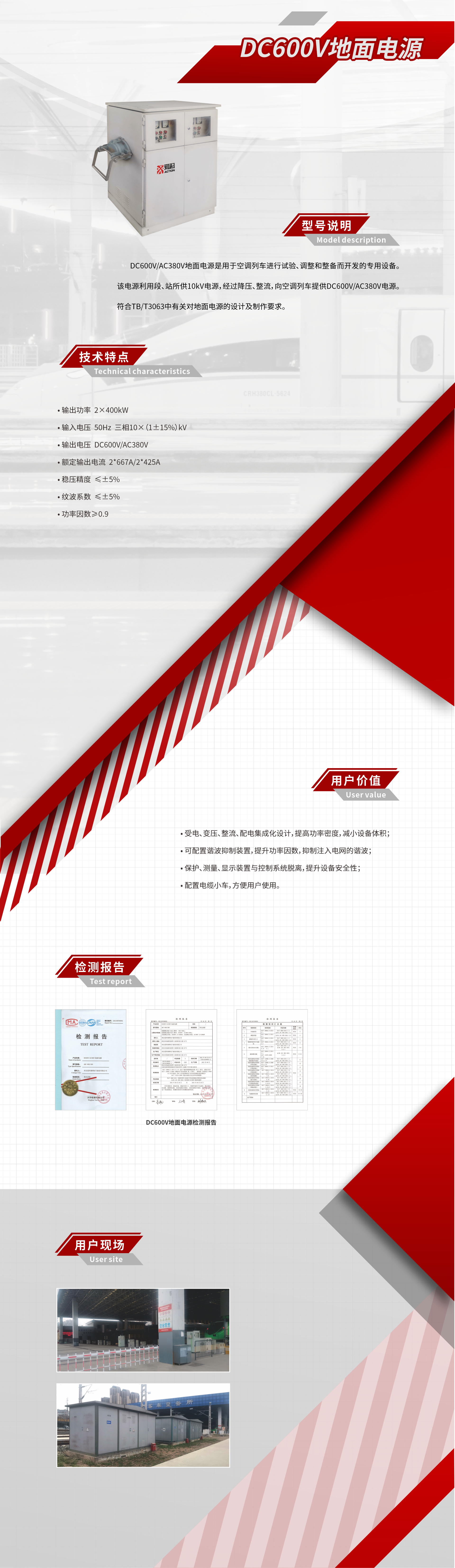DC600V/AC380V地面電源是用于空調(diào)列車進行試驗、調(diào)整和整備而開發(fā)的專用設備。該電源利用段、站所供10kV電源,經(jīng)過降壓、整流,向空調(diào)列車提供DC600V/AC380V電源。符合TB/T3063中有關(guān)對地面電源的設計及制作要求。