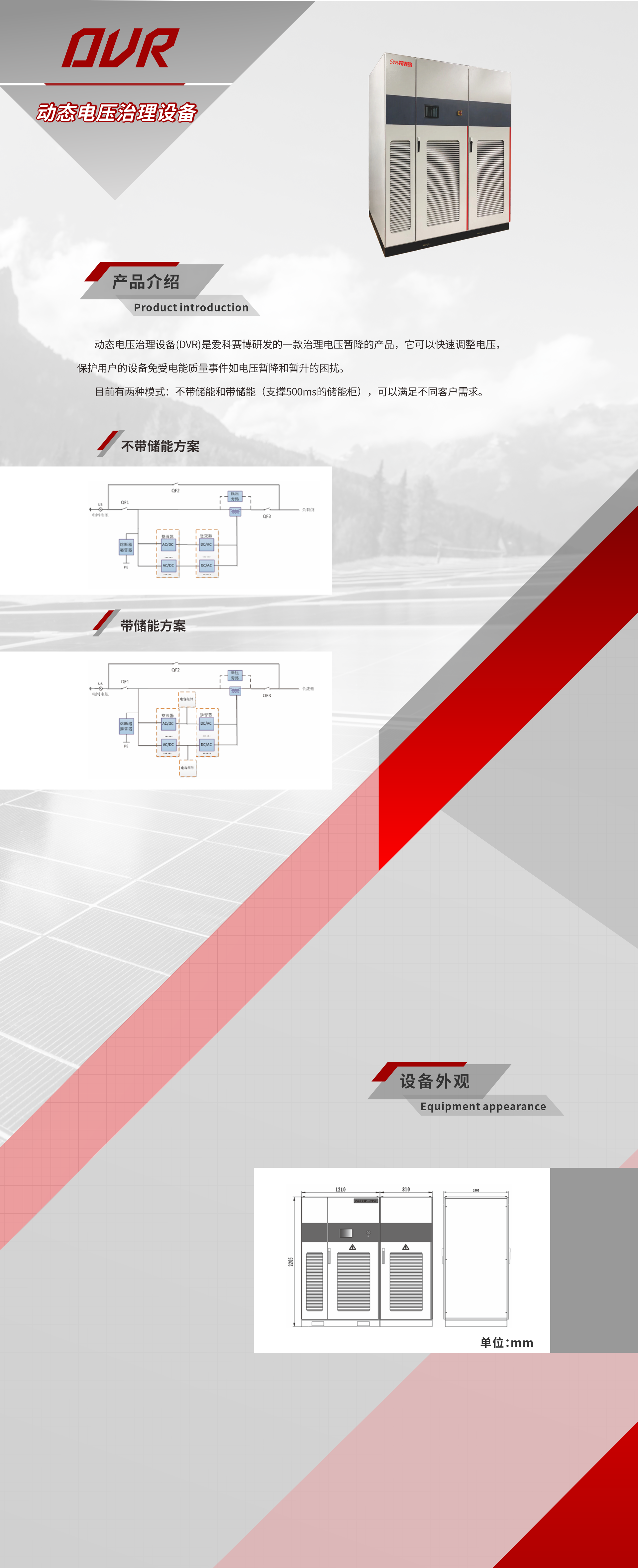 動態電壓治理設備(DVR)是愛科賽博研發的一款治理電壓暫降的產品,它可以快速調整電壓,保護用戶的設備免受電能質量事件如電壓暫降和暫升的困擾。 目前有兩種模式:不帶儲能和帶儲能(支撐500ms的儲能柜),可以滿足不同客戶需求。