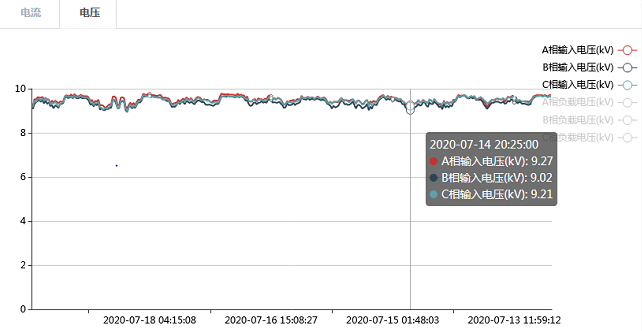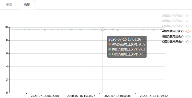 投入10kV串聯(lián)調(diào)壓裝置前,末端線(xiàn)路10km處電壓在9kV上下波動(dòng),考慮到裝置前后級(jí)都有負(fù)載用電的情況,補(bǔ)償輸出電壓設(shè)定為9.6kV;裝置投運(yùn)后,電壓穩(wěn)定在9.6kV左右,補(bǔ)償效果良好,保障了后級(jí)供電的穩(wěn)定性。