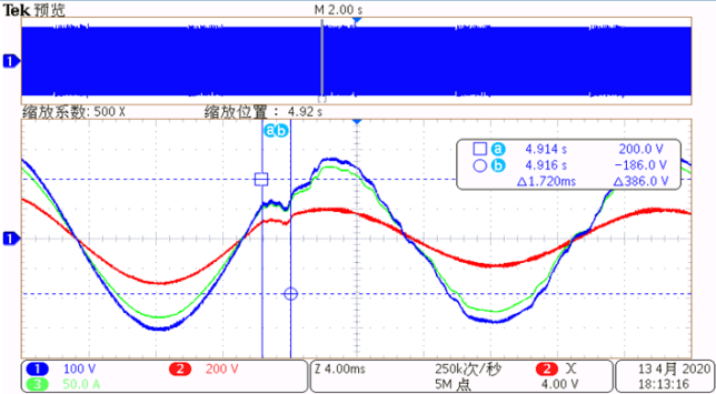 圖一,圖二,圖三,分別是電網(wǎng)電壓在0°,30°,60°下發(fā)生暫降,由圖可以看出,當(dāng)電網(wǎng)發(fā)生暫降時(shí),電壓暫降治理設(shè)備可快速補(bǔ)償,響應(yīng)時(shí)間均小于3ms。