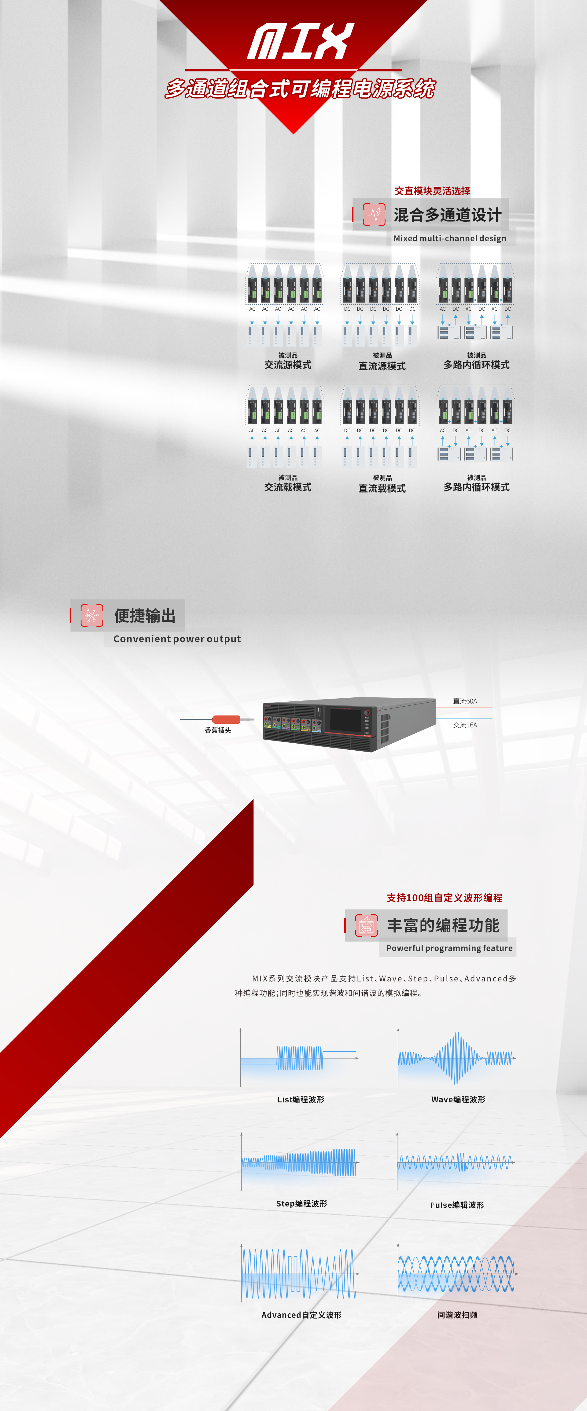 MIX系列多通道組合式可編程電源系統是一款創新設計的電源供應系統,專為滿足實驗室、研發中心及工業自動化測試領域對高精度、多功能電源需求而設計。該系統采用模塊化設計理念,允許用戶根據實際需求靈活配置交流(AC)模塊和直流(DC)模塊,實現高效、靈活的電源解決方案。廣泛應用于微逆、微儲、便攜式儲能、家電產品、工業電子等產品的開發和運用。